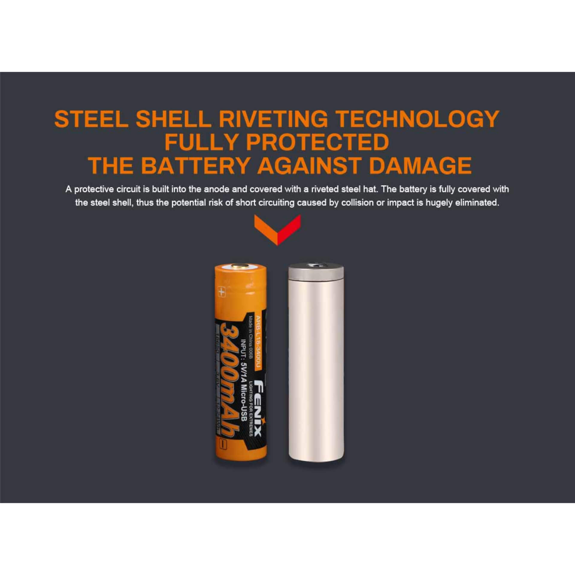 Fenix ​​ARB-L18-3400U is a high capacity rechargeable 18650 Li-ion battery with built-in protection against short circuit, overcharge, over discharge and overheating. The battery also has pressure relief valves to prevent an explosion.