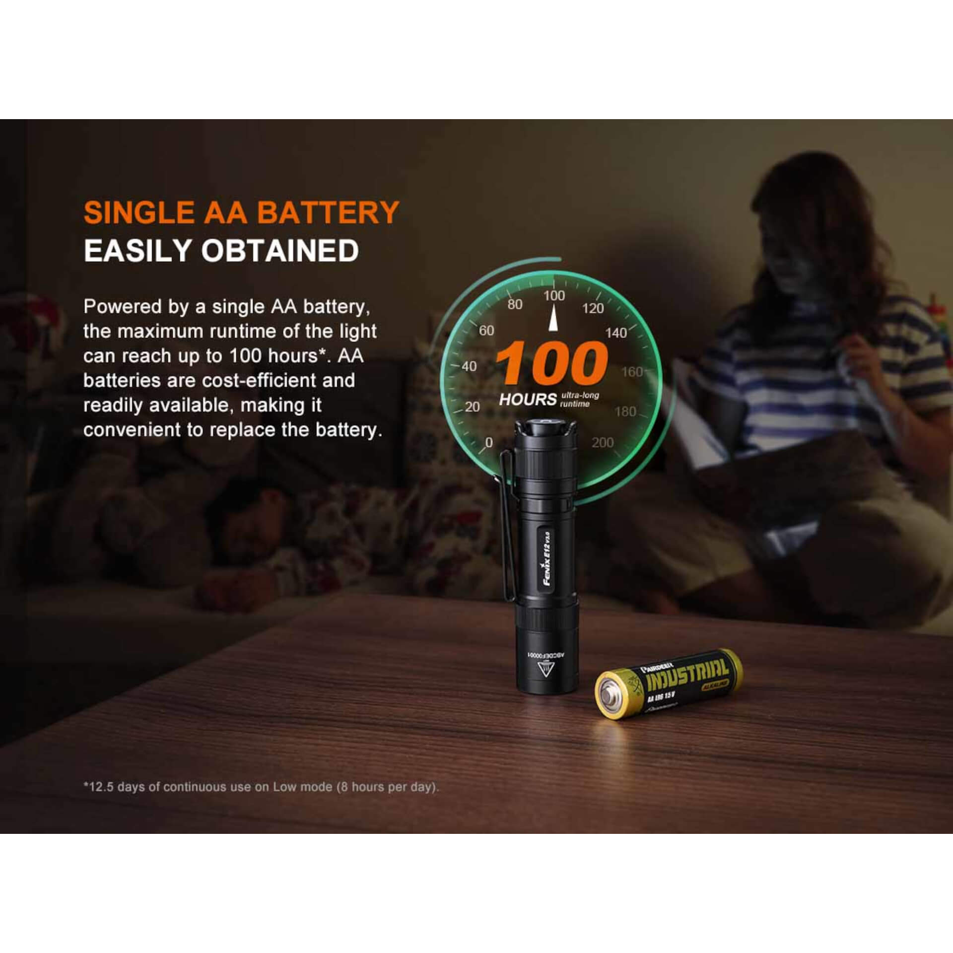 Fenix E12 V3.0 flashlight, AA battery, extra o-ring, strap