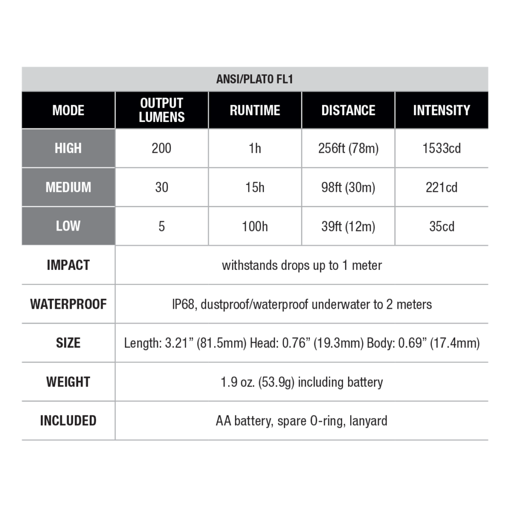 The Fenix E12 V3.0 can withstand rough handling, as it is made of aircraft aluminum with a hardened coating, polycarbonate lens and IP68 rating for dust and water resistance.