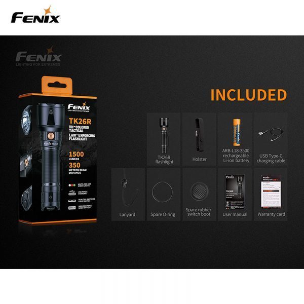 TK26R, Fenix ARB-L18-3500 rechargeable li-ion battery, USB Type-C charging cable, lanyard, holster, spare O-ring, spare rubber switch boot.