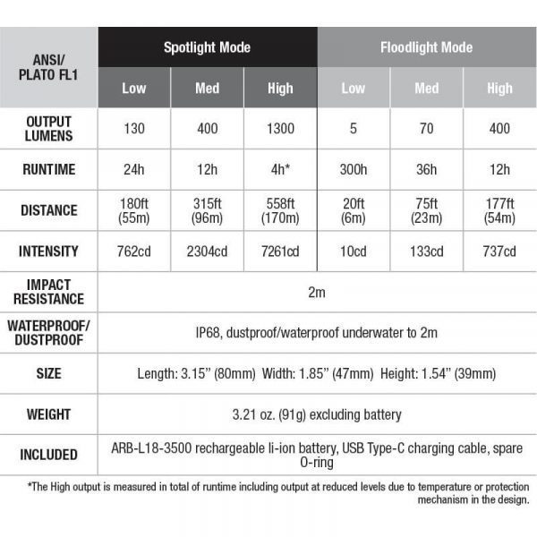 Powered by an 18650 Li-Ion (included) rechargeable battery, or two CR123A alkaline batteries (not included).
