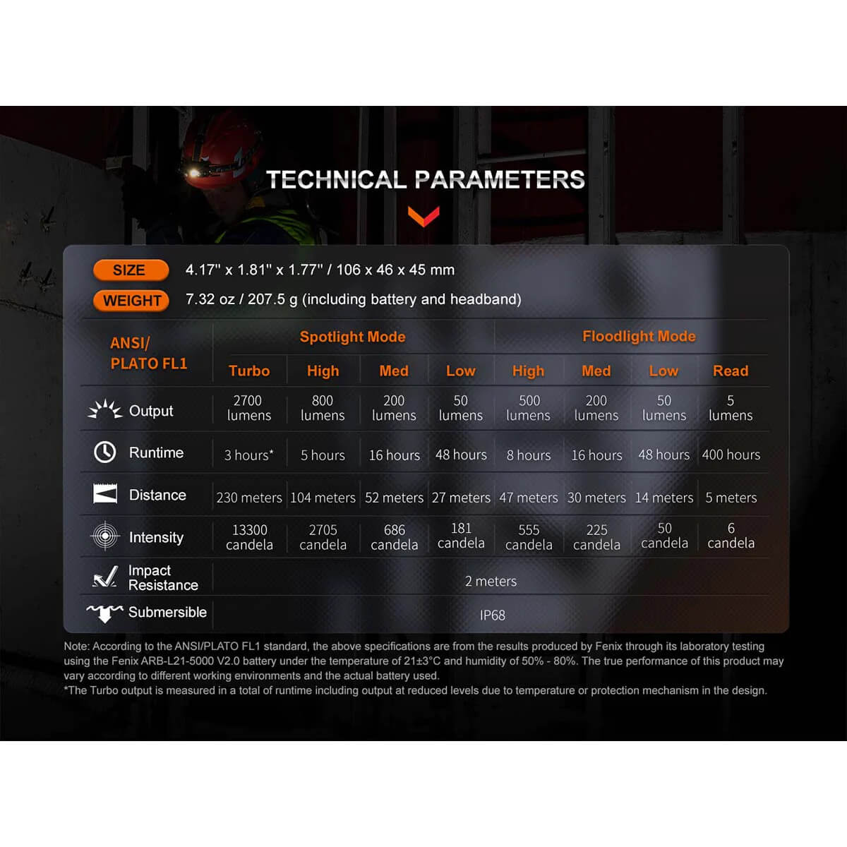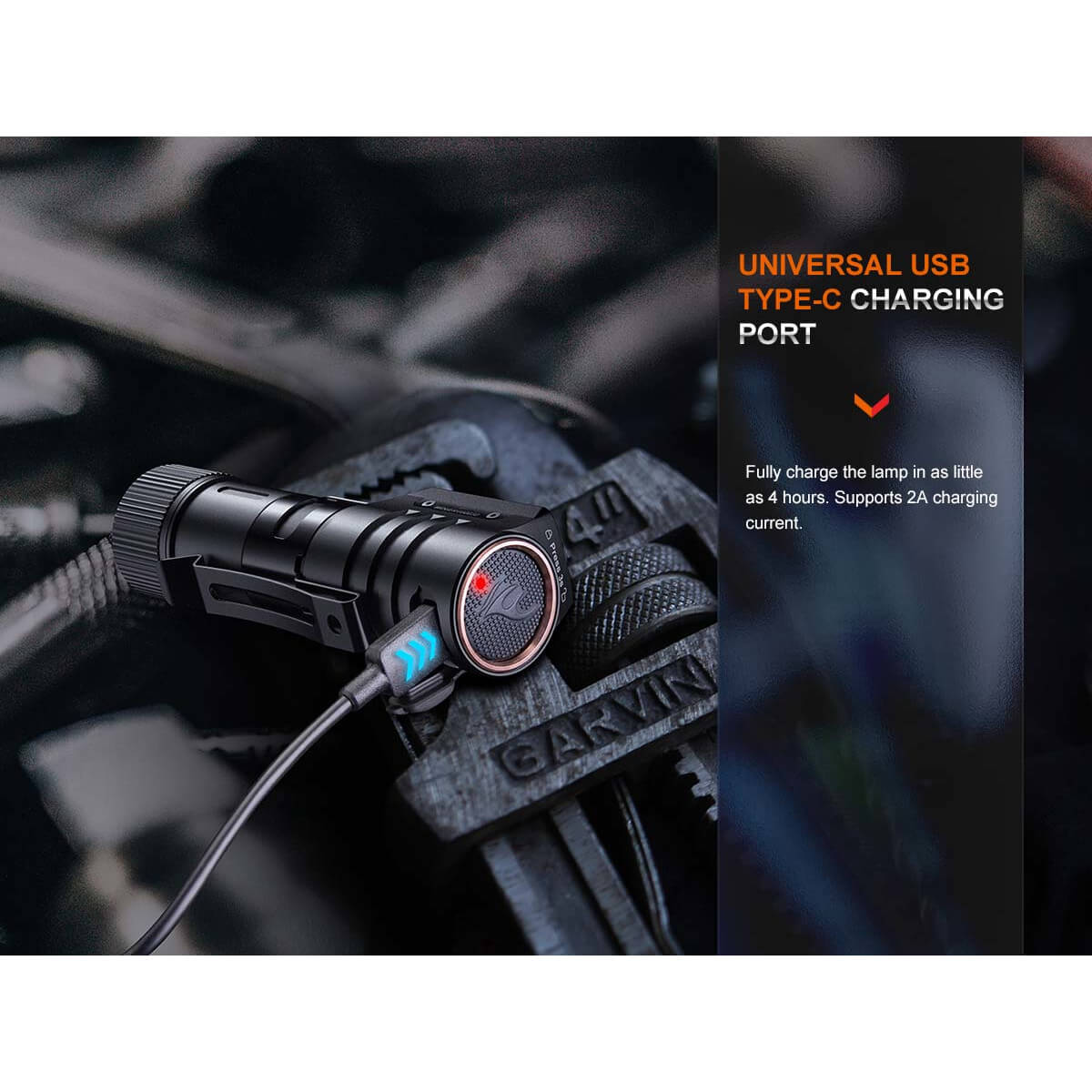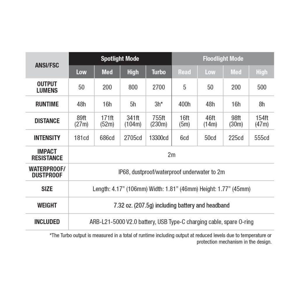 Fenix HM71R headlamp, ARB-L21-5000 battery, USB Type-C charging cable, extra O-ring