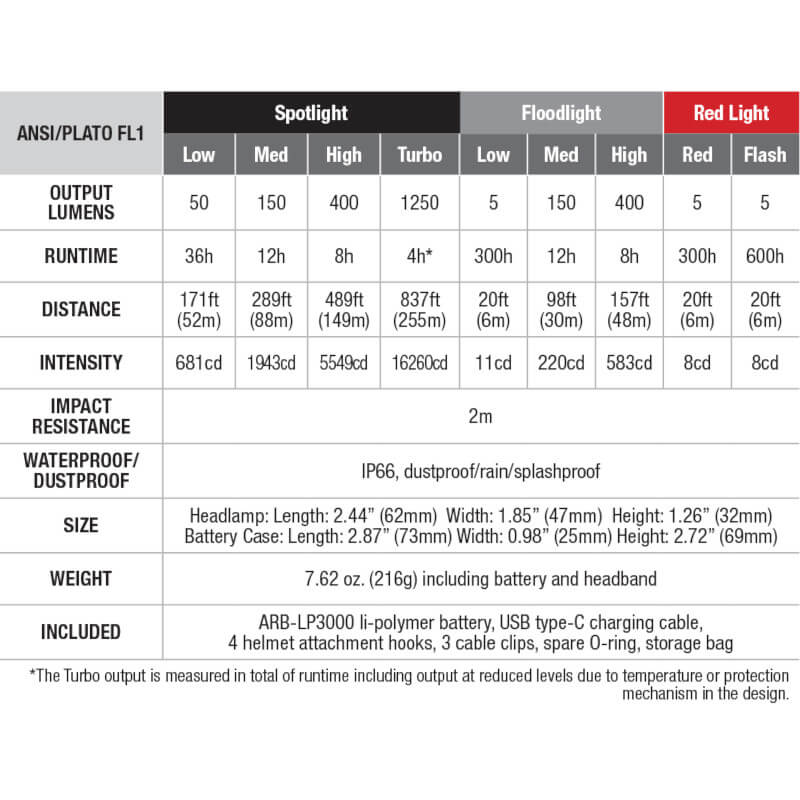 HP16R, ARB-LP3000 Li-po battery, USB-C charging cable, 4 helmet attachment hooks, 3 cable clips, extra O-ring, storage bag