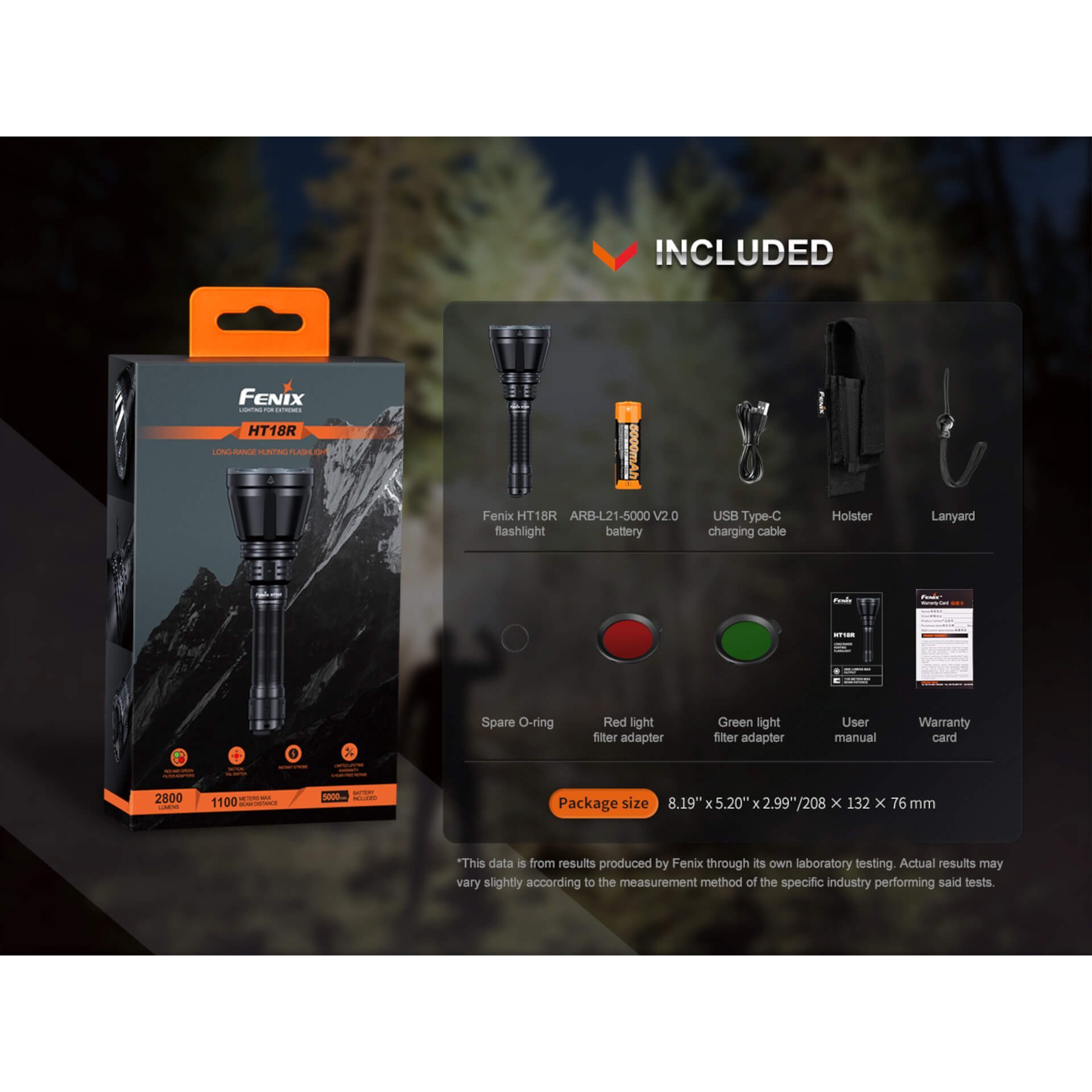 Fenix HT18R flashlight, ARB-L21-5000 V2.0 battery, USB type-C charging cable, lanyard, holster, extra O-ring, red light adapter, green light adapter