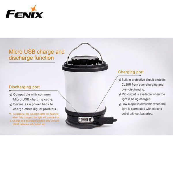 The Fenix CL30R certainly is a powerhouse of a camping lantern that contains many features. You are provided a max of 650 lumens that can illuminate an area of 35 meters in diameter (@0.25Lux). Brightly illuminate entire rooms and charge other electronic devices at the same time with the versatile CL30R lantern. This rechargeable LED lantern features a standard USB port to charge your phone, speaker or tablets. Equipped with five brightness levels and alert flashing, this lantern is great for car camping, rustic cabin stays and even power outages. The Fenix CL30R is the perfect camping, hiking, and all adventure activities companion. The cold-resistant battery compartment makes it perfect for all-season usage. You have the option of using either one, two, or three 18650 batteries to power the CL30R. You are also able to either attach the Fenix CL30R to a tripod or you can hang it.