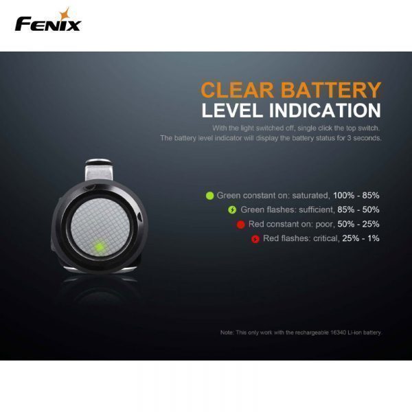 Powered by one 16340 rechargeable Li-ion battery or one 3V CR123A Lithium battery (not included).
