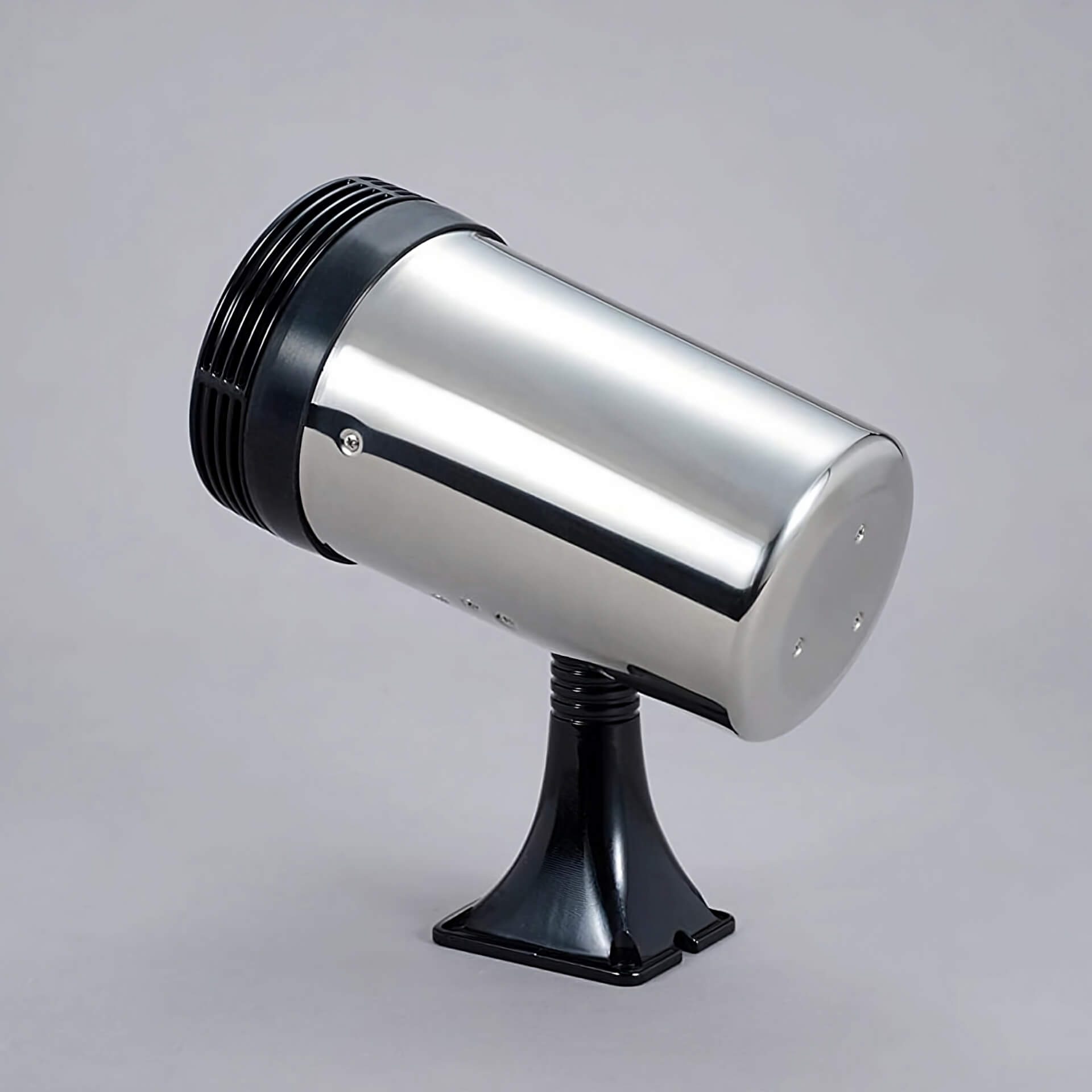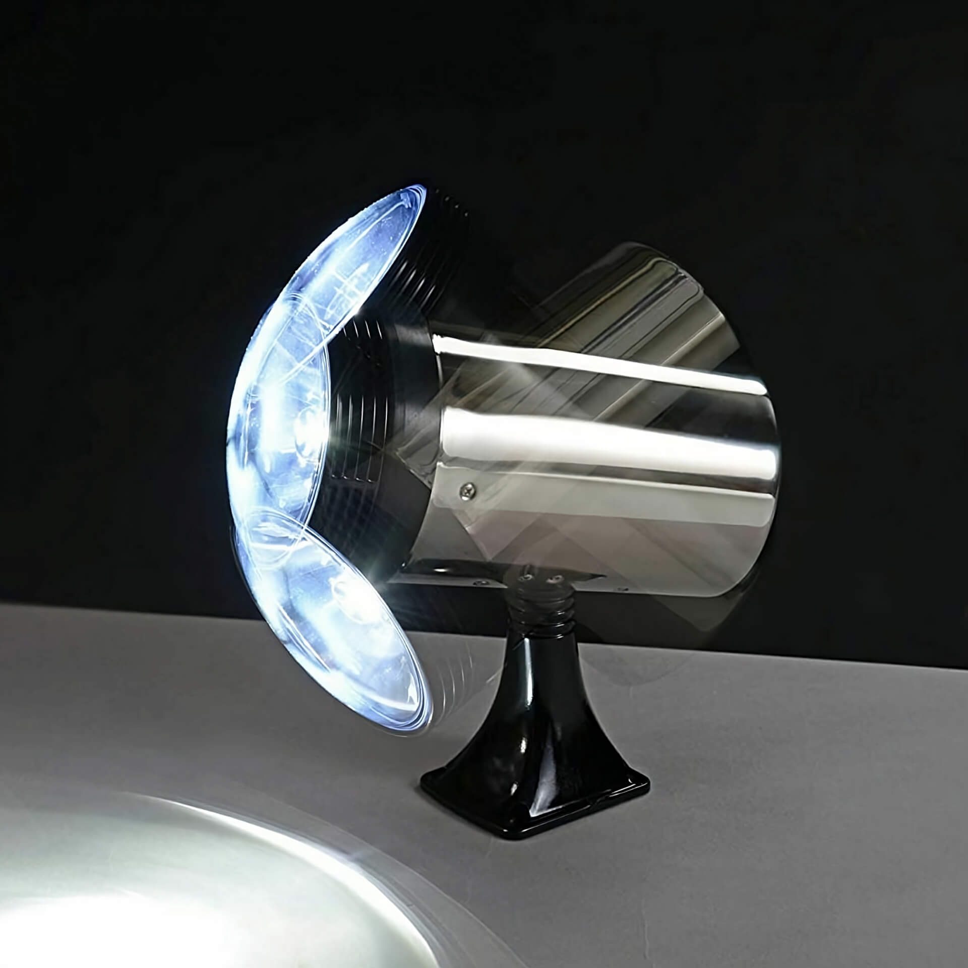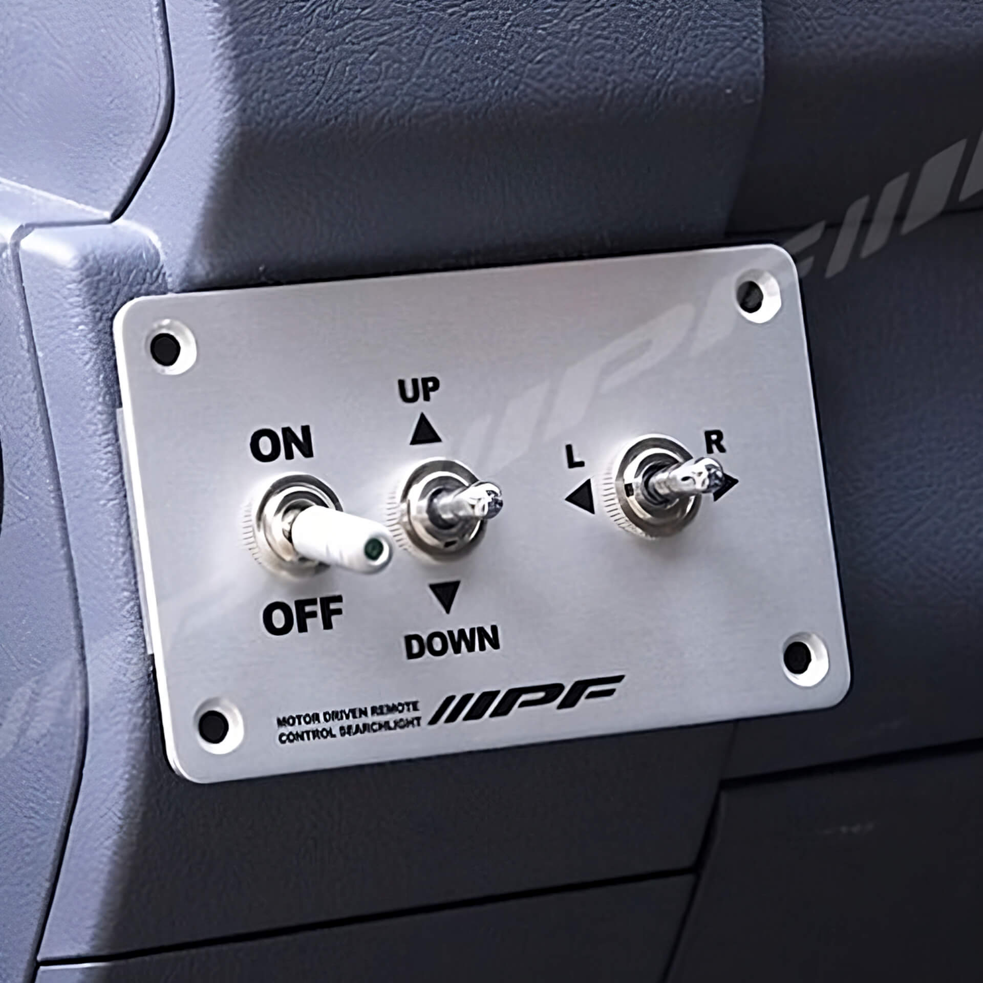 The LED search light has double motors (28W) which enable simultaneous movement in both vertical and horizontal directions. It can be angled 75 degrees vertically and 360 degrees horizontally. The LED search light is easily managed with the included control panel that can be mounted inside a vehicle.