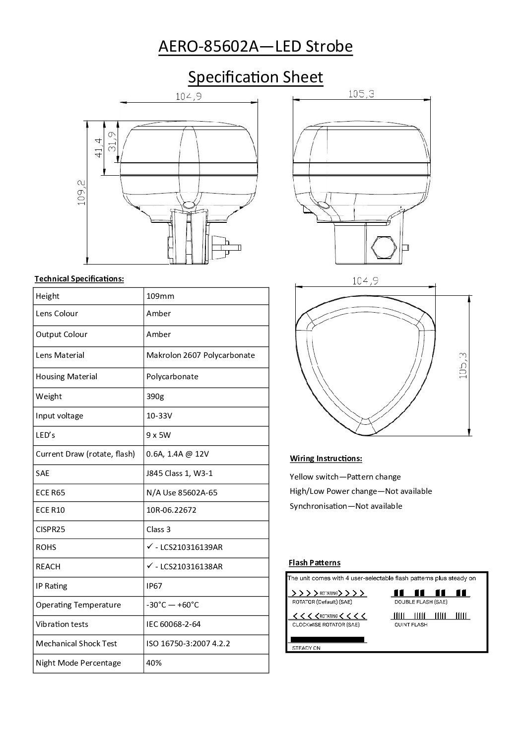Marking: ECE R65 Class 2, CISPR 25 Class 3, SAE Class 1