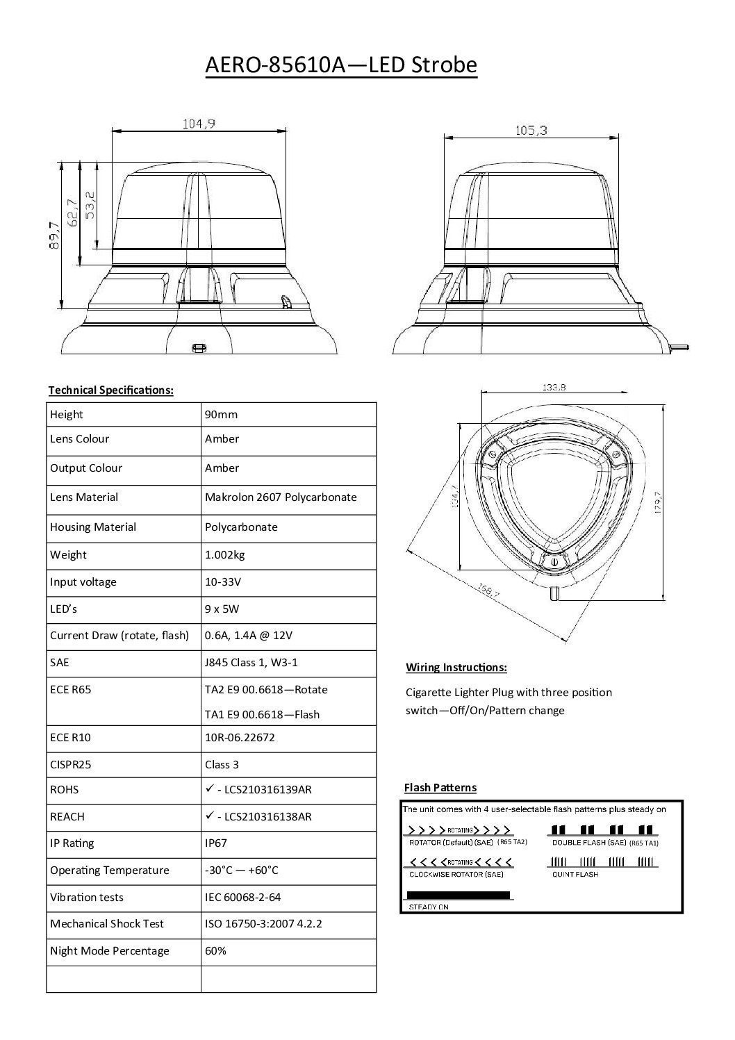 Marking: ECE R65 Class 2, CISPR 25 Class 3, SAE Class 1