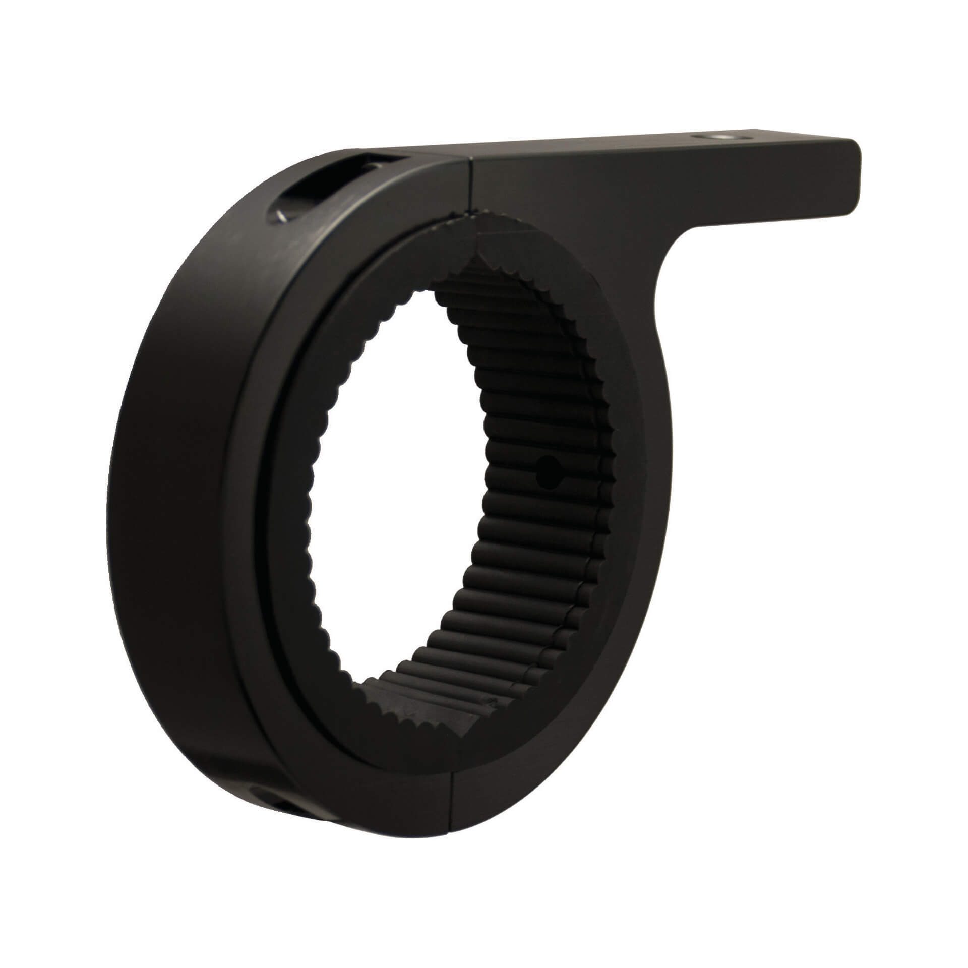 The bracket is made of black anodized aluminum and includes a protective rubber insert for easier installation and protection of the tube where the bracket is mounted. The hole in the bracket fits an M10 mounting bolt.