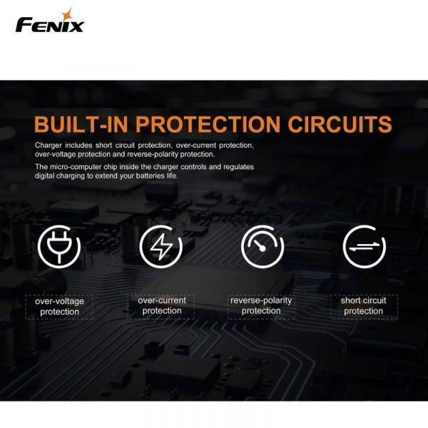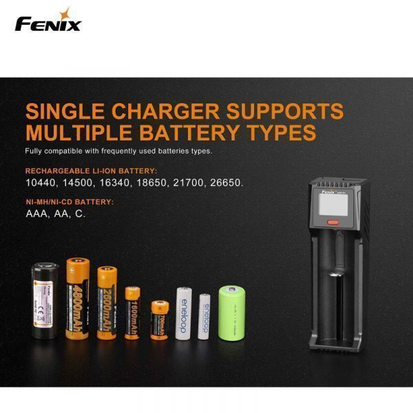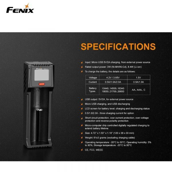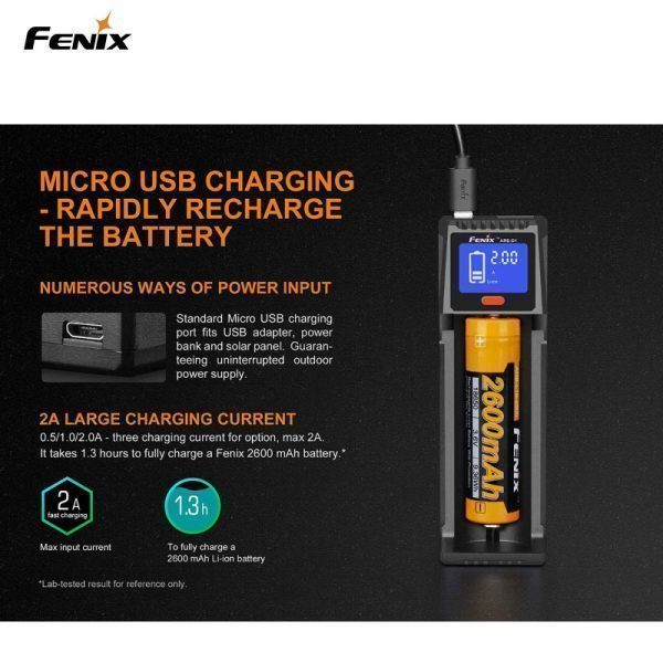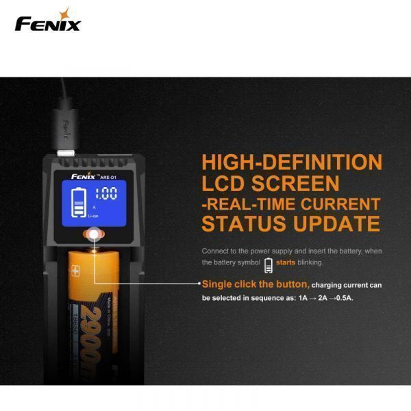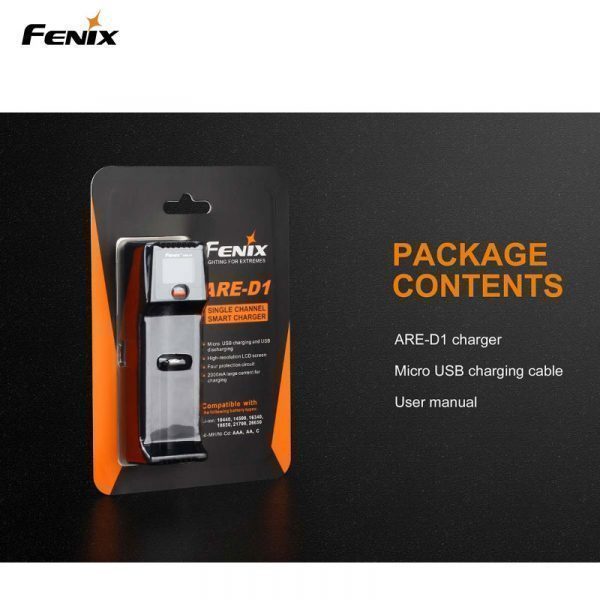 Fenix ARE-D1 är en intelligent kombination av batteriladdare och powerbank som kan hantera ett stort antal olika laddbara batterier. Laddaren ställer själv in korrekt laddström och spänning efter att batteriet har satts i. Den lättöverskådliga bakbelysta LCD-skärmen kan visa batterispänning, laddström och förfluten laddningstid. Laddaren drivs via Micro-USB ingången från valfri USB-källa. Med ett laddat batteri i ARE-D1 kan den även användas som en portabel powerbank, och kan då ladda din telefon eller annan utrustning via den större USB A-porten. Batteri ingår ej.