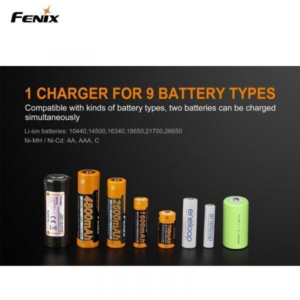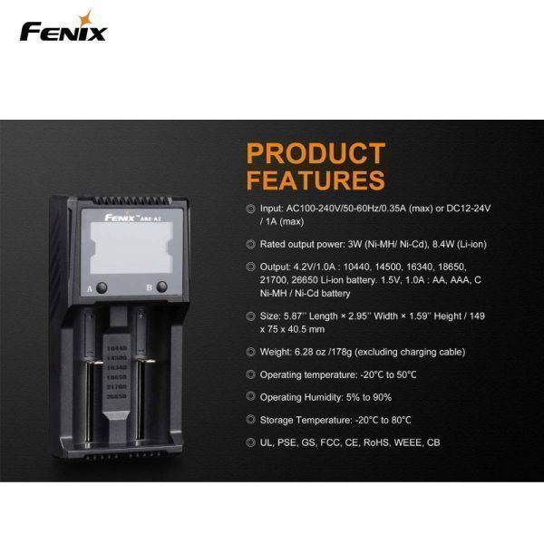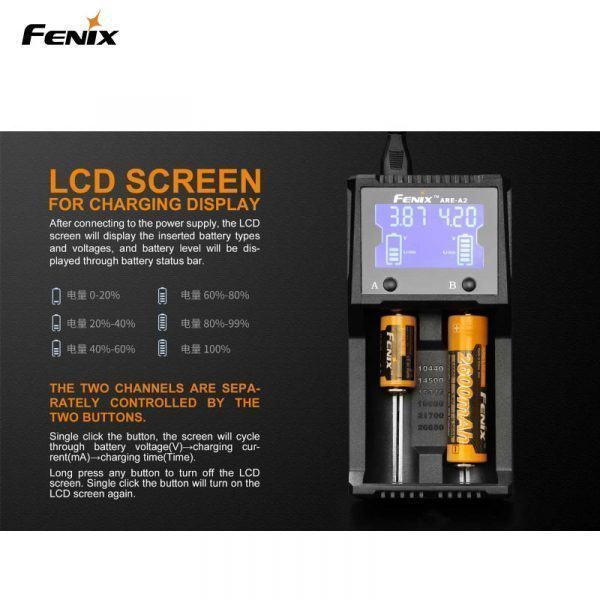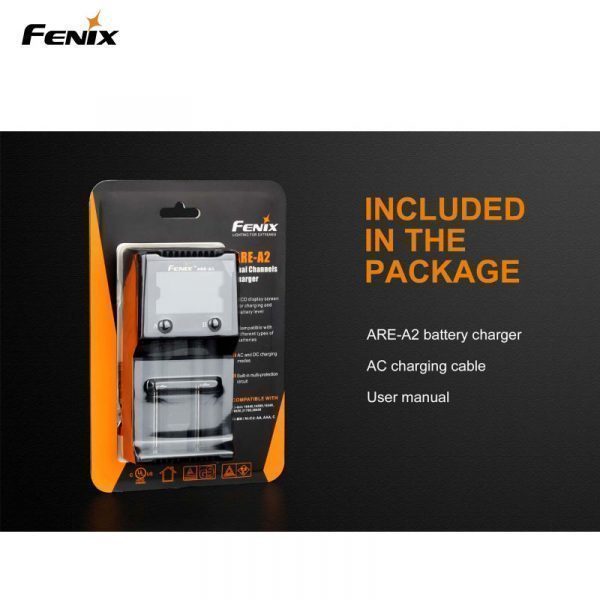 Fenix ARE-A2 är en intelligent två-kanals batteriladdare som kan hantera en mängd olika laddbara batterier. Laddaren ställer själv in korrekt laddström och spänning efter att batteriet har satts i. Den lättöverskådliga bakbelysta LCD-skärmen kan visa batterispänning, laddström och förfluten laddningstid. Laddaren drivs antingen med nätspänning eller via DC-ingången (12-24V) med korrekt bilkabel och kontakt. Batterier och bilkabel ingår ej.