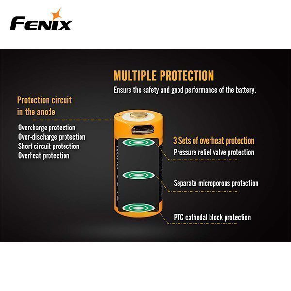 Batteriet rekommenderas till Fenix ficklampor PD25, PD32, PD35, PD35 TAC, RC09, TK15C, TK15UE, TK16, TK32, TK35, TK35UE and E15.