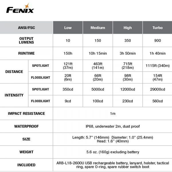 Denna fokuserbara ficklampa har inte bara variabel spridningsvinkel utan även fyra olika effektlägen samt strobe-läge. En enkel vridning av lamphuvudet ändrar ljusbilden från smalt spotläge med 340m räckvidd, till ett brett 81° vidvinkligt läge som lyser upp närområdet. FD41 med sin reglerbara ljusbild och kompakta format är en ficklampa som fungerar i nästan alla sammanhang.