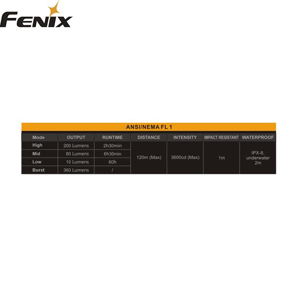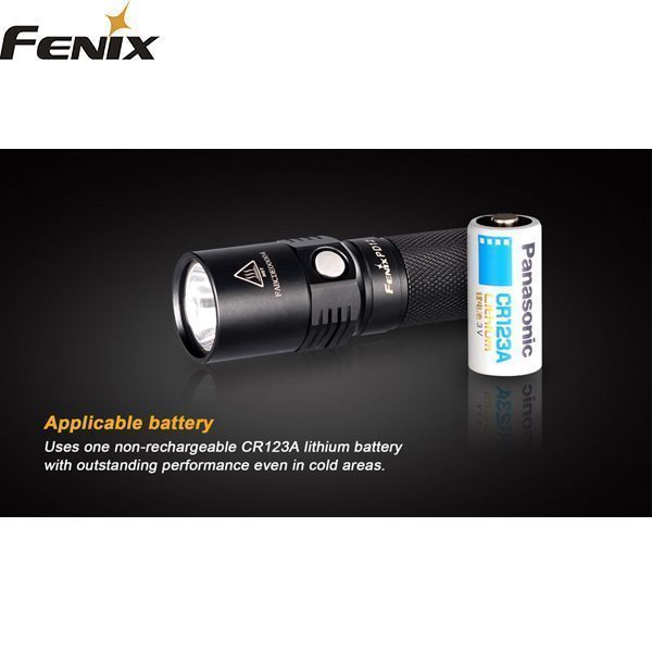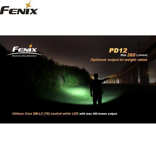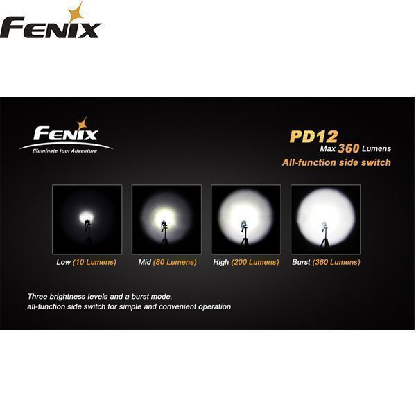 Fenix PD12 ficklampa genererar 360 lumen på max effekt i så pass litet format att du lätt kan ha med dig den varje dag i fickan, väskan m.m. Tre ljusnivåer och ett burst-läge som styrs på sido-brytaren. PD12 är pålitlig, tålig, ANSI – rankad och endast ett enda CR123A batteri behövs för att Fenix PD12 ska ge kraft där det behövs.