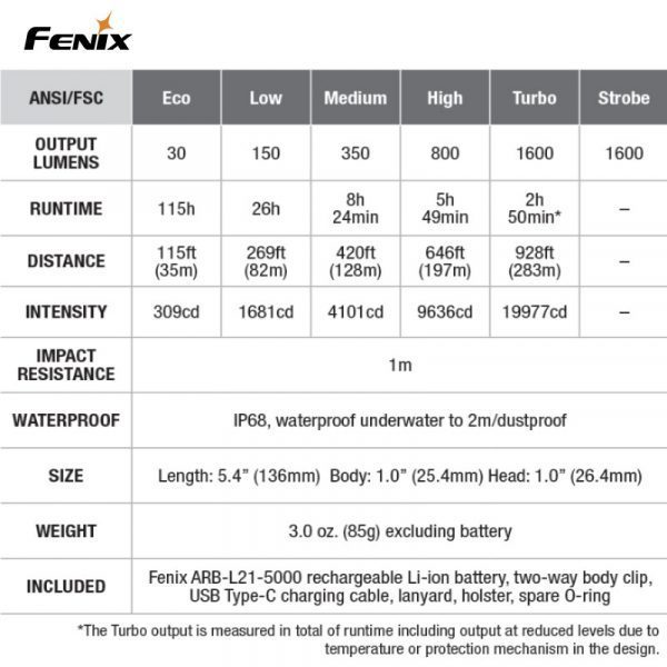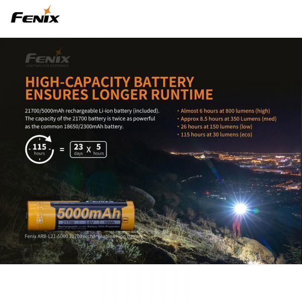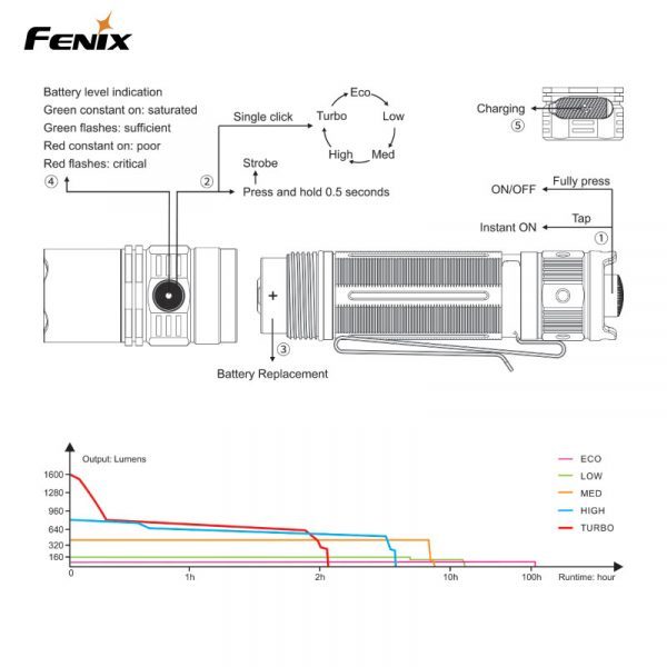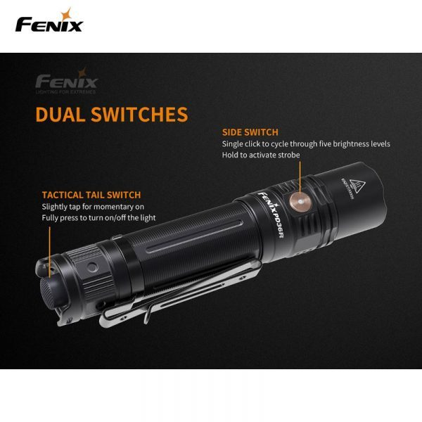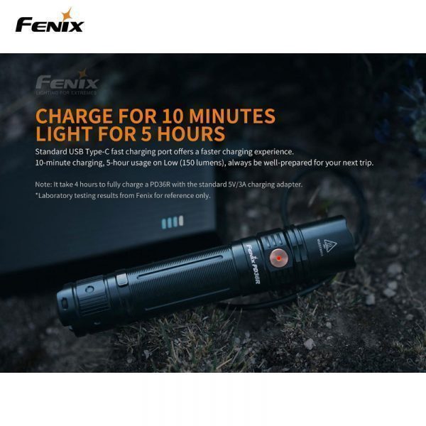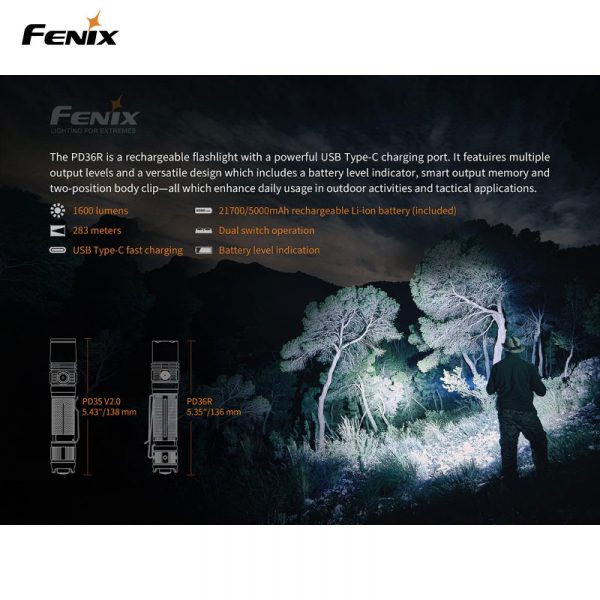 Fenix PD36R är en högpresterande ficklampa som inte har många konkurrenter på marknaden i sin storleksklass. Denna laddningsbara ficklampa levererar maximala 1600 Lumen till ett imponerande avstånd av 283 m (ANSI). Fenix PD36R är vår första produkt med ett 21700 Li-Jon batteri som har nästan dubbla kapaciteten jämfört med ett standard 18650, därför behöver inte denna lampa laddas lika ofta som andra motsvarande ficklampor. Batteriet i PD36R kan snabbt och enkelt laddas via USB-C-porten på ficklampan. Dessutom har du alltid full koll över batteriets laddningsstatus med en snabb blick på den inbyggda batterinivåindikatorn.