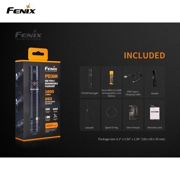 PD36R, ARB-L21-5000 Li-Jon batteri, två-vägs klämma, USB-C laddkabel, rem, hölster, O-ring.