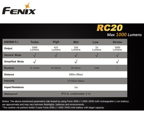 FENIX FICKLAMPA RC20 1000 LUMEN