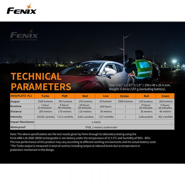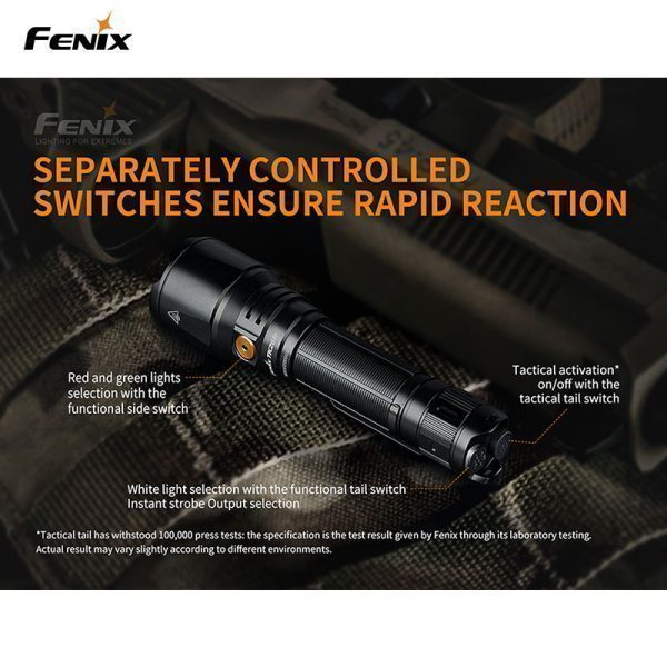 Fenix TK26R är en mycket mångsidig ficklampa. Förutom fem olika effektlägen för vitt ljus finns även rött och grönt ljus vilka är mycket användbara vid signalering vid väg eller på stora avstånd. När lampan drivs med det inkluderade 18650 batteriet kan det leverera ett ljus på hela 1500 lumen når hela 350 meter bort (@0.25 Lux). Handhavandet är enkelt och snabbt tack vare de tre knapparna. En strömknapp för momentant eller fullt påslag, samt en separat knapp för effektreglering av det vita ljuset. Sidoknappen används för att välja färgen på ljuset. Byggd av flygplansaluminium och med O-ringar eller gummitätningar i alla öppningar. Passar mycket väl för yrkesmässigt bruk inom jakt, polis och räddning.