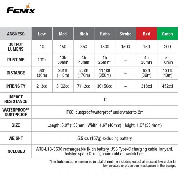TK26R, Fenix ARB-L18-3500 laddbart li-ion batteri, USB-C laddkabel, rem, hölster, reserv O-ring, reserv gummitätning till knapp.