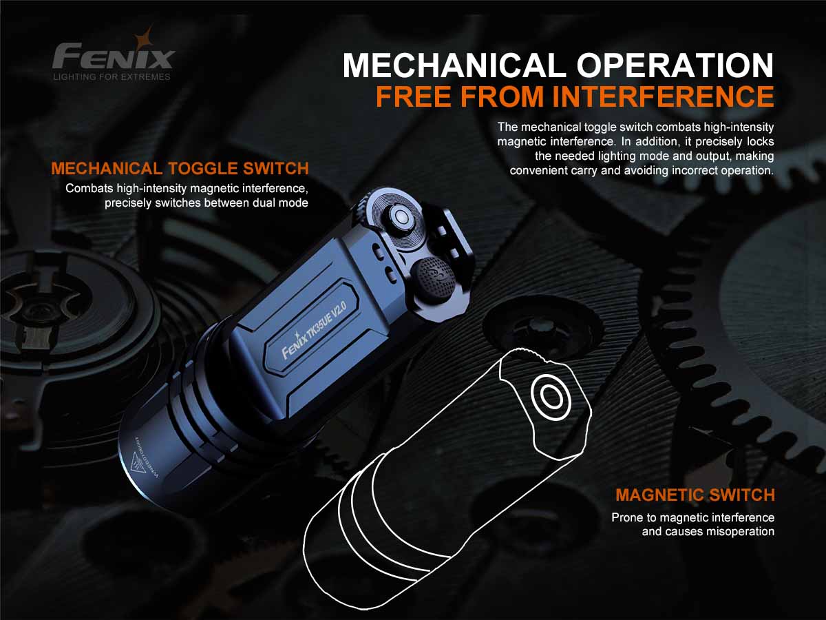 Fenix TK35UEV2.0 ficklampa är nyligen uppgraderad för att ge en maximal effekt på 5 000 lumen. Den innovativa vippströmställaren låter dig snabbt växla mellan taktiskt läge, arbetsläge och spärrfunktionen.