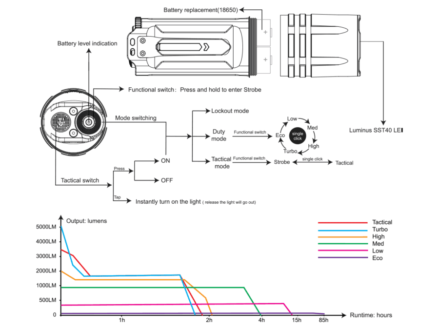 Batteriindikatorn låter dig veta om de två 18650 Li-ion-batterierna (ingår ej) behöver laddas. Vattentät, dammtät och slagtålig med en maximal ljustid på 85 timmar i Eco-läge.
