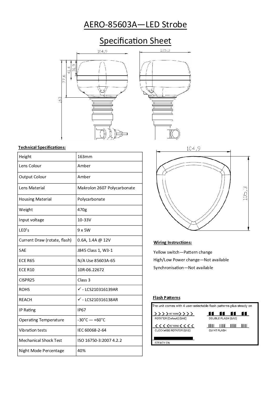 Märkning: ECE R65 Class 2, CISPR 25 Class 3, SAE Class 1